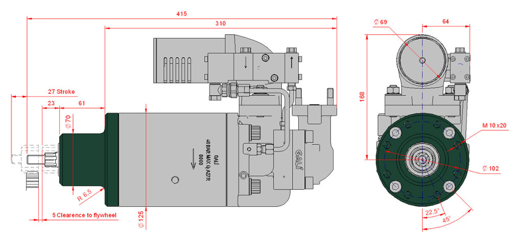 A27型空气启动马达可以启动功率220kW到1100kW(300到1500马力)左右的柴油机,其核心参数有气缸的行程,缸数和直径,和啮合齿轮和柴油机飞轮的传动比。
